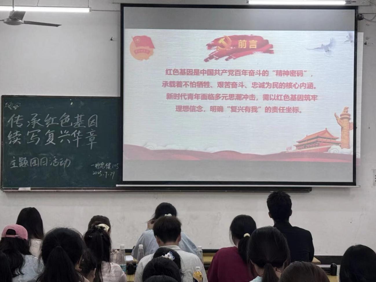 为激励青年学生扛起复兴重任,筑牢青年理想信念,9月29日下午,财经学科部于明德楼105教室开展了“传承红色基因,续写复兴华章”主题团日活动。本次团日活动由曾杏主持。