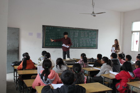 (图为大学生志愿者走进课堂为小学生讲授绘画课。)