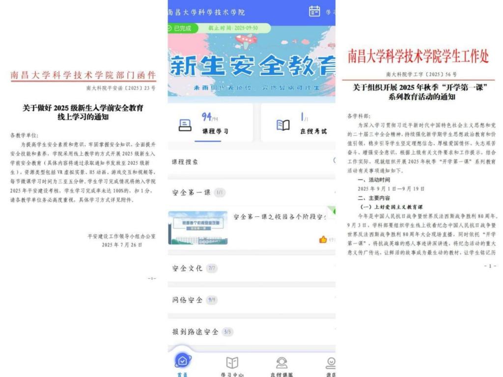 入学教育作为新生踏入大学的“第一课”,是筑牢思想根基、培育综合素养的关键环节。新生入学前,学院组织新生线上自主学,开展2025级新生安全教育,打好入学“预防针”;入学后,采用线下集中学模式,上好“开学第一课”,线上线下共同构筑起涵盖“爱国教育”“安全教育”“心理健康教育”等24项主题的课程矩阵,以模块化、系统化的教育内容,帮助新生扣好大学“第一粒扣子”。