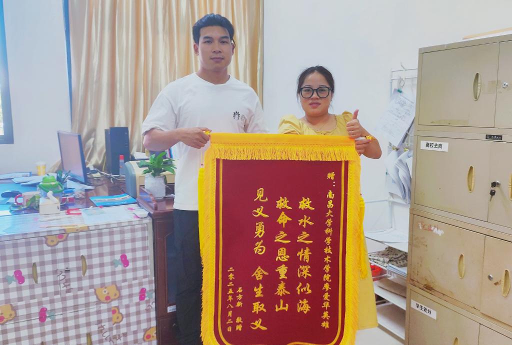 暑期,理工学科部土木工程222班退役士兵学生廖爱华见义勇为,获赠锦旗。