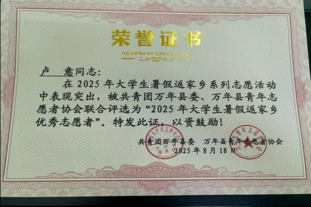 汉语言文学232班的卢意同学,于万年县工商联开展实践期间,认真负责地参与文书起草、信息采集、档案整理等基层工作,凭借扎实的文字功底和严谨细致的工作态度,出色完成各项任务。此外,她还积极投身“返家乡”系列志愿服务活动,因表现突出、贡献显著,被共青团万年县委、万年县青年志愿者协会联合授予“2025年大学生暑假返家乡优秀志愿者”称号,成为同学们身边可学可做的榜样。