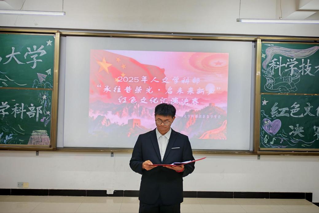 11月3日下午,人文学科部于明德楼238教室举办了“承往昔荣光,启未来新声”红色文化文艺汇演决赛。本次活动由大学生宣讲团团长翟博文,第二十一届歌手大赛十佳歌手杨善羽、王子盈,大学生主题演讲比赛二等奖获得者李淑琦担任评委,杨浚熙担任主持人。